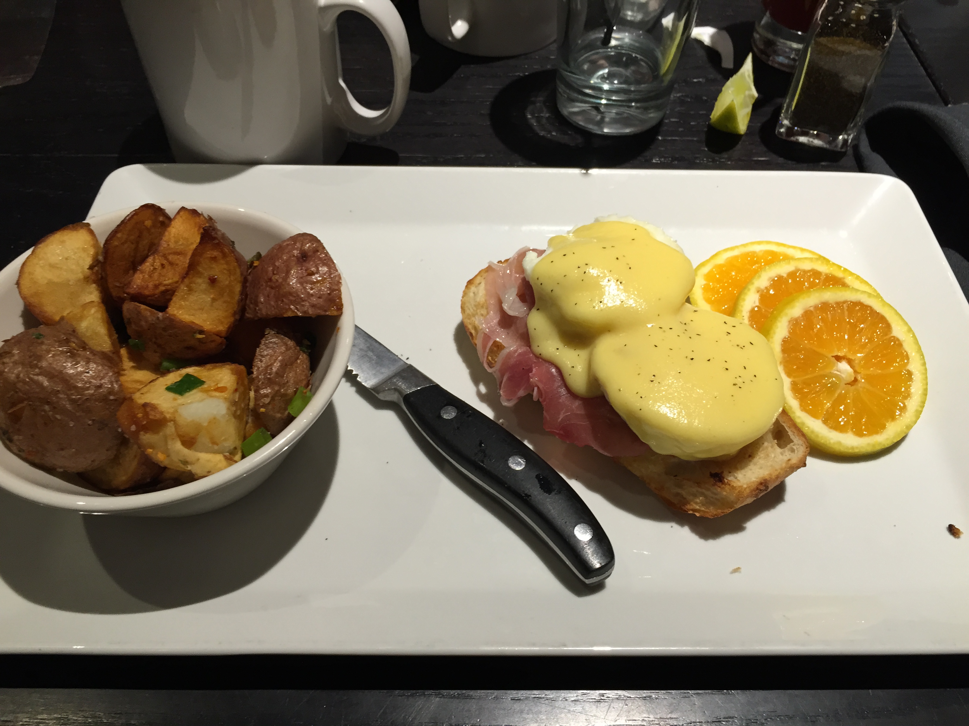 The first egg was a tad soft. But still certainly within the realm of “could maybe be medium depending on the way you look at it”. The hollandaise was lovely and zingy. Not too salty at all. It had a nice flavour to it. It didn’t knock me out with big flavours… it was a bit more subtle. But overall it was a very nice sauce. The salt came mostly from the proscutto underneath the egg which worked nicely with the dish. The tomato was nice and crispy, not soggy at all. The second egg, having the benefit of resting for a couple of minutes was a perfect medium. It had the ooze which I was able to mop up with my crispy and delicious cubed hashbrowns which accompanied the dish. Overall, it was a very satisfying eggs benedict. Eggs were nicely done, the hollandaise was not overpowering, but rather complimentary to the egg and meat. It was almost like an extension of the yolk. Very nice.