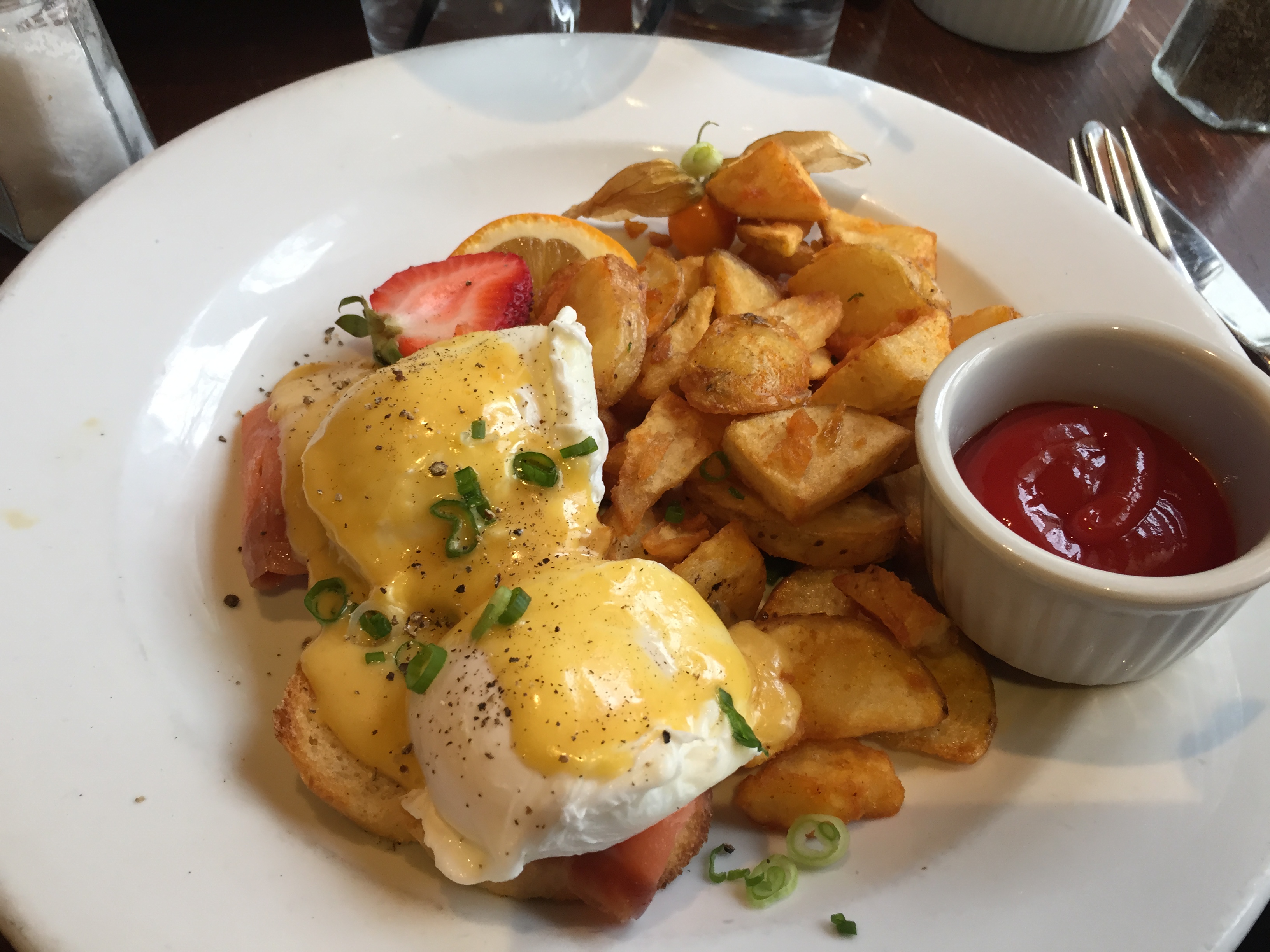 The hollandaise was strange. Certainly not bad in any way! Just unique. For all I know, that could be the traditional French method of making hollandaise sauce. It was fine, but it tasted… cheesy? Its hard to explain (especially without my notes!). It wasn’t salty, which is fantastic because the salmon was taking good care of that. I’m never a fan of the fruit going right next to the saucy eggs… but that’s just me getting really picky. Overall, it was a satisfying, albeit different dish. The atmosphere was cozy, the server was lovely, and the food was nicely prepared. I’m interested to try the traditional ham benedict when I return in the future. Overall, well done.